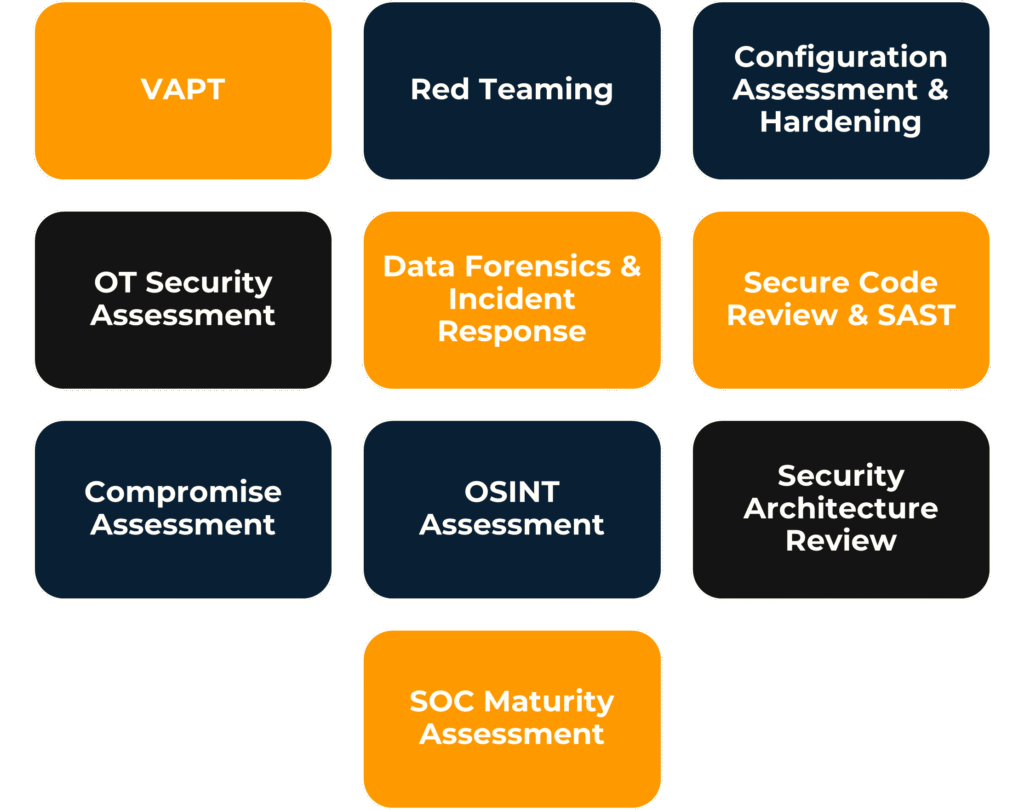 Stay ahead of threats with our advanced cybersecurity assessments. From VAPT and red teaming to DFIR and SOC maturity reviews, we identify vulnerabilities and mitigate threats before attackers find a way in. We help you build security that you can trust.